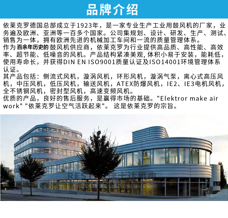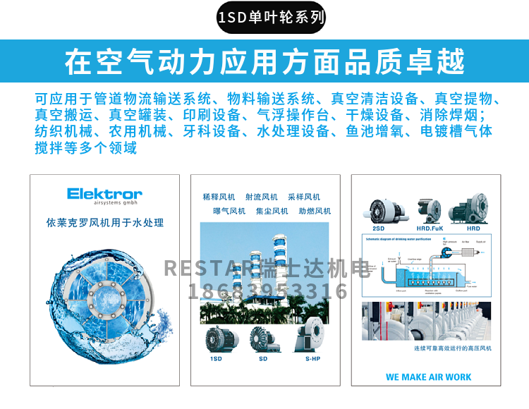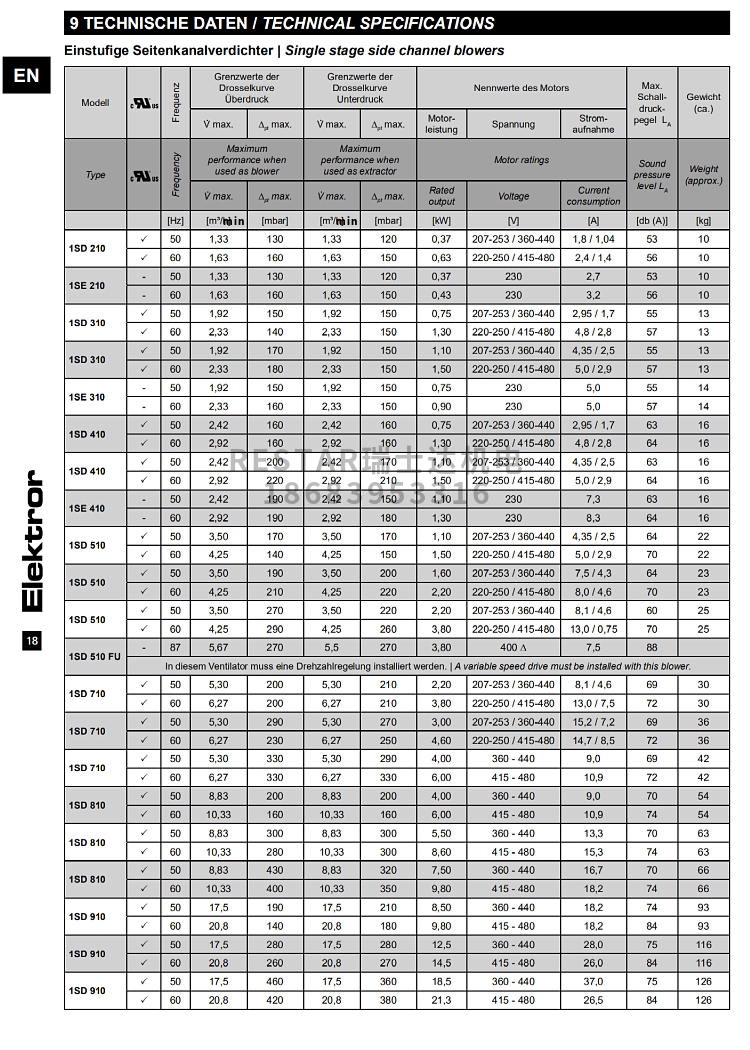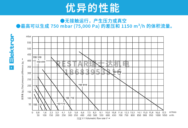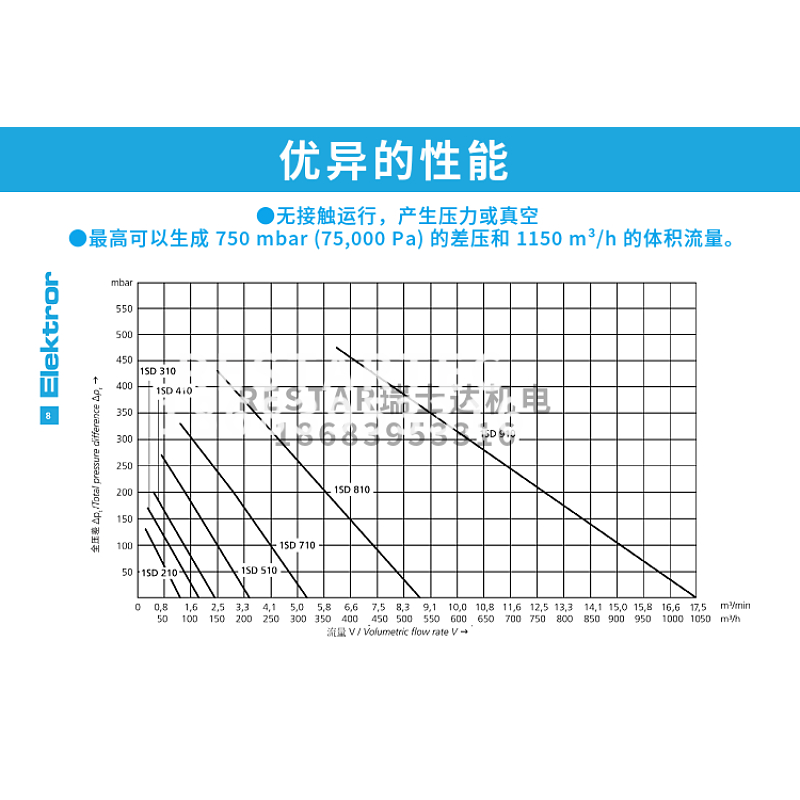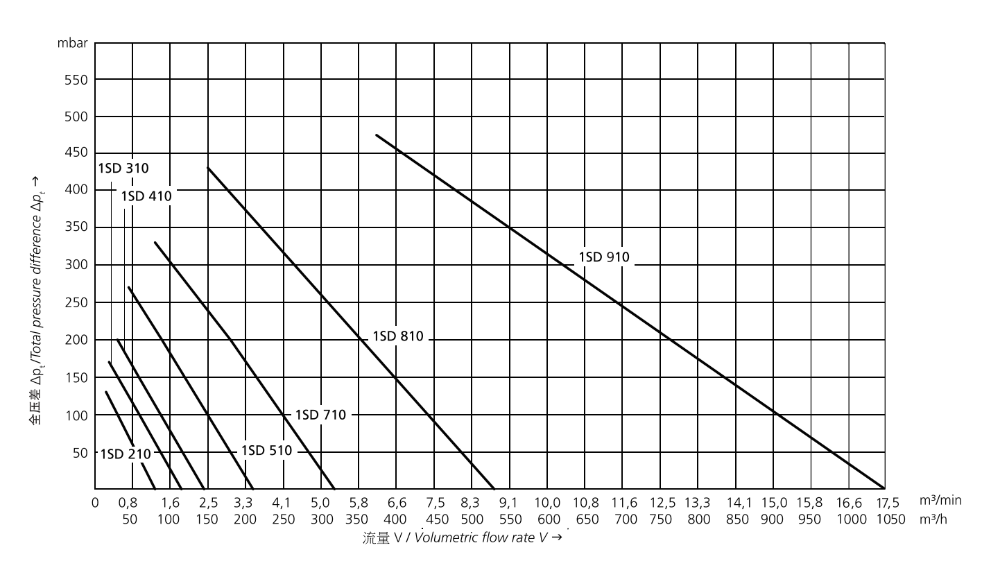 Elektror 侧流风机最高可以生成 750 mbar (75,000 Pa) 的差压和 1150 m³/h 的体积流量。Elektror 侧流风机的产品方案包含 单级系列(SD、1SD)、双级系列(2SD) 以及仅允许用变频器运行的侧流风机 (SD-FU/FUK)。为了提高效率,原则上还可以通过变频器对我们所有的侧流风机机进行调节。